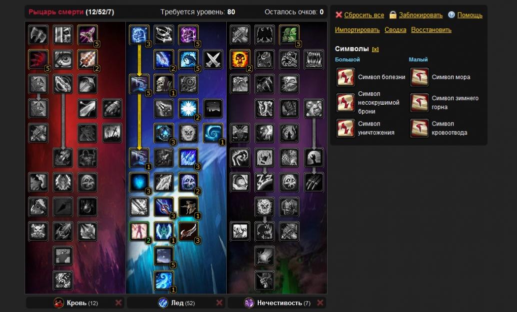 Этот билд очень вкусный по своим возможностям = его владелец бафает пати или рейд сразу и Силой поганища, и Цепкими ледяными когтями. Актуально только для 5ппл и 10-к где мы, вероятнее всего 1 ДК... Захват рун+Усиленный захват рун и Кровавая метка дают неплохой самоотхил любителям хиляться без хилов или когда хилы в ж*пе или рейд проседает.