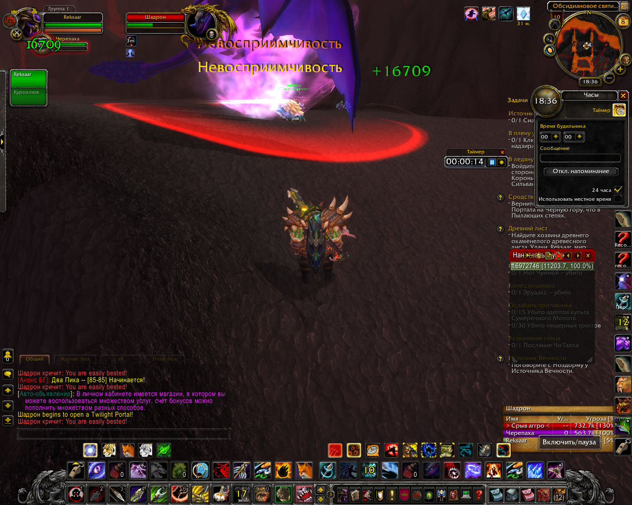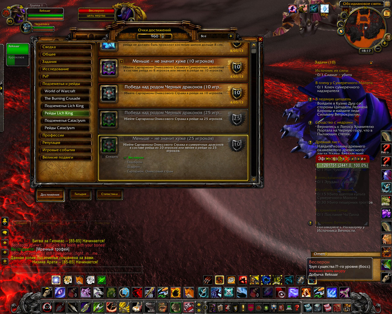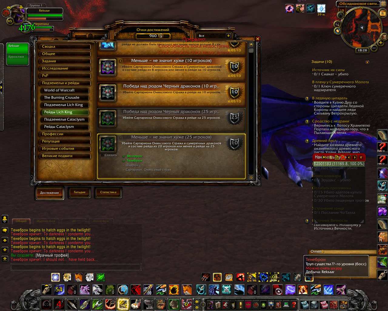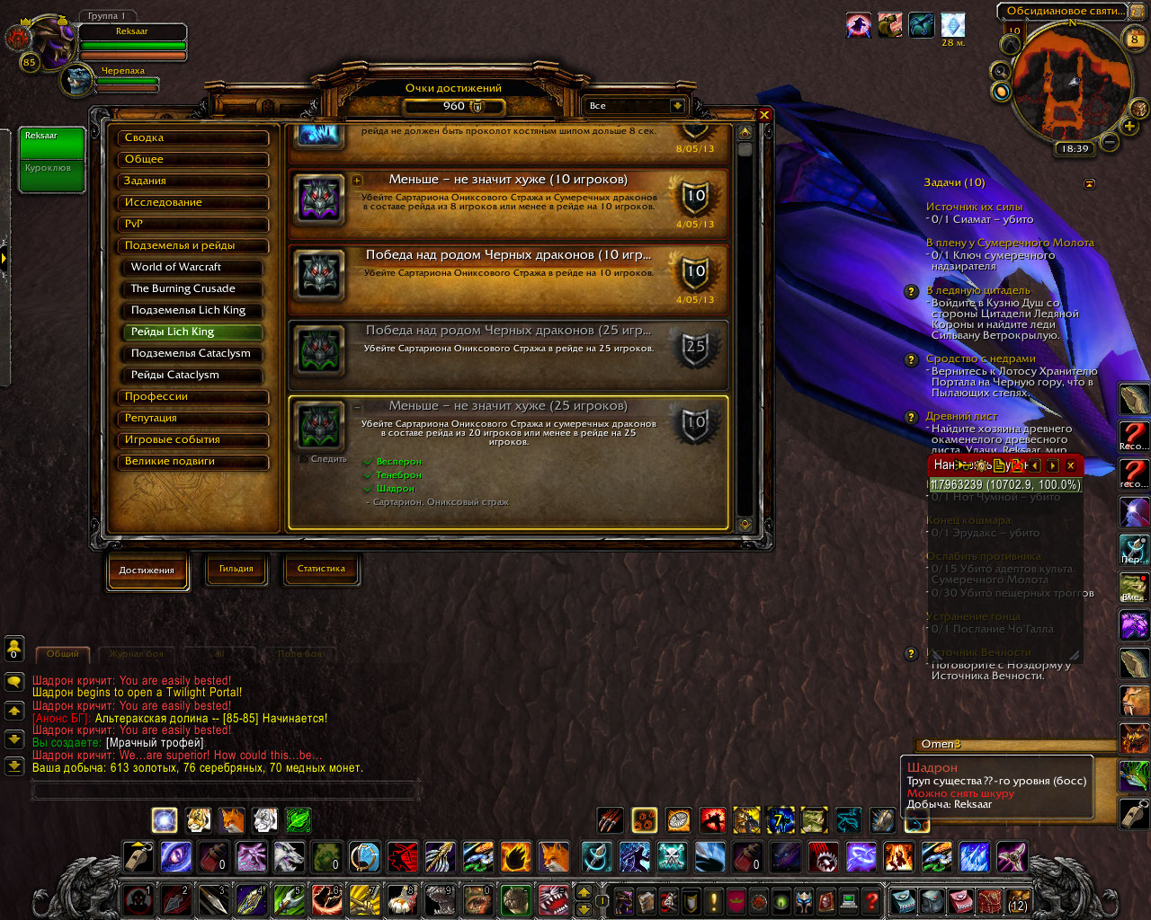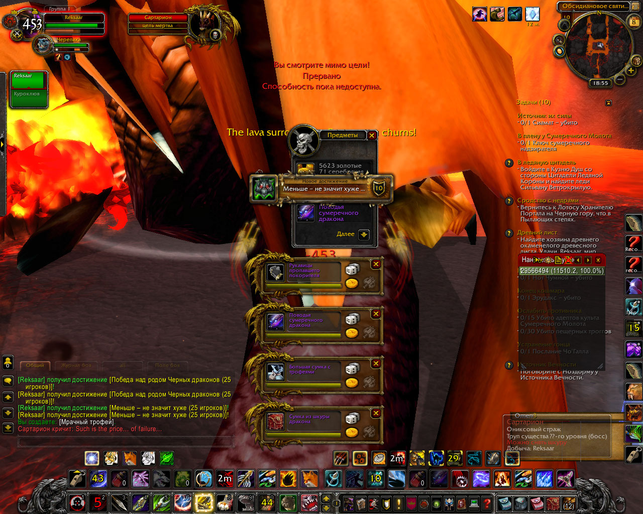 Около часа назад пал Сартарион Ониксовый Страж, а также 3 сумеречных дракона: Весперон, Шадрон и Тенеброн в режиме на 25 игроков. Бой длился примерно 10 минут. Дропнулись 8 к голода( вместе с сумкой), сумеречный дракон и перчи(токен)х2+куча всякого латного треша. Также выяснились подробности про драка со щитом. Оказалось, что вешает он щит на 28 секунд интервалом в 32 секунды.