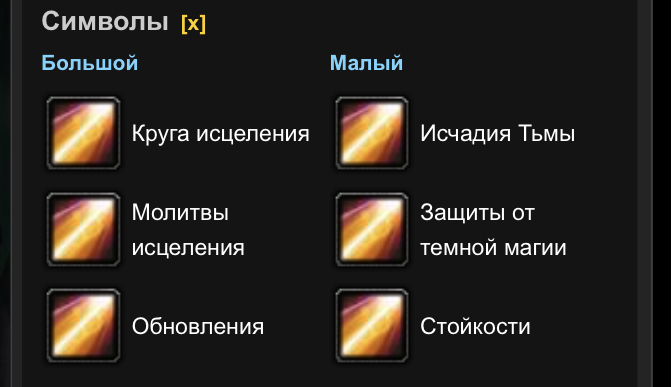 https://wowroad.info/?item=43371 и https://wowroad.info/?item=43372 - какой смысл в них? ты все равно перед пулом отопешься, а во время боя есть https://wowroad.info/?spell=48161 и аддоны, которые сами таргетно раскидают бафы