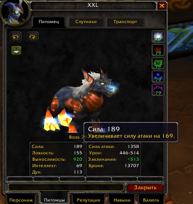 Скрин 2 статы пета с прокаченным талантом "Опытный дрессировщик" - вроде все норм есть +10% АП