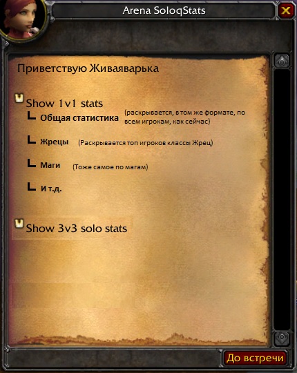 1. Необходимо поменять формат отображения статистики у НПС "Arena SoloqStats". А именно, в категории "1х1", помимо общей статистики(топ 15), добавить рейтинги по каждому классу т.е. выглядеть это должно примерно так: