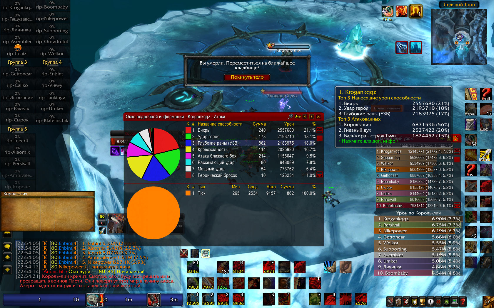 Крога не в обиду но даже если ты дашь 25к на выходе, с истериями от двух дк по кд, припотами, едой, триксами, Стаф один хрен даст больше тебя на 2к. Так к слову я хожу без припотов и двух истерий, и даю на выходе на 1к дпс меньше при таком же нанесенном уроне. Да ты и сам знаешь что в норм рейде ты не набьешь 12 миллионов урона за бой лича.