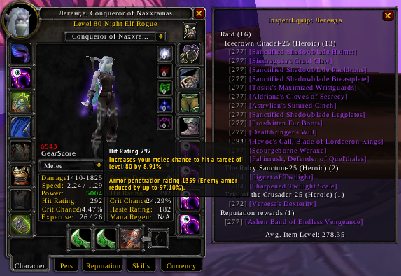 Плюсы сборки: Оптимальное кол-во статов, больше хита без просадок по криту. Бис лист с целью вытеснить миссы автоатаки из развертки и превратить их в криты. Меткость варьируется от 292 до 322 в зависимости от фракции (за альянс роге ВСЕГДА нужен дреней в пати, потому что вместо 3 чистых камней в хит пихаются 3 10аги+10хит, чтобы повысить криткап для автоатак, который нивелируется дренеем). В этой сборке также собираются все сокетбонусы за исключением шеи (нигде не собирается т.к. синий) и ботинок (+6 аги с 2 желтых дыр). Помимо этого, не будет миссов ядов в пачки при фул хит камнях (315 кап на яды без шп, а с 322 по пачкам треша на которых нет дебафа яды миссовать не будут). ЕДИНСТВЕННАЯ сборка помимо 6531 в которой можно гонять с Инжой + Портнягой!