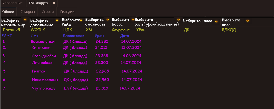 https://uwu-logs.xyz/top?server=WoW-...cls=-1&spec=-1 (здесь уже есть раздел WoW-Circle, но пока что популярность этой платформы на нашем сервере очень низкая)
