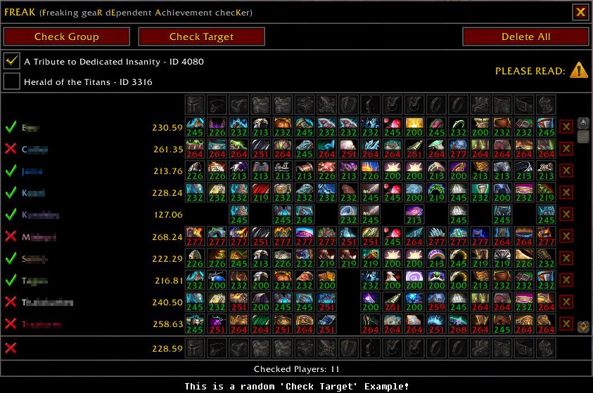 5) добавление окна сканирования участников групп/рейда или цели аналогичное FREAK, но с Tooltip'ами, которые содержат камни, чарки, а также индикацией установки/отсутвия камней, факта прочаренности предмета, который можно прочарить и итоговых значений по ailvl, % камней, % чарок, (в дальнейшем % эффективных талантов для спека)