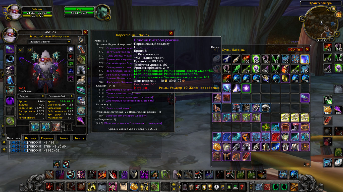 Бабенок, альянс, гном, бис пве, пвп 3/5 А8 (плечи, голова, штаны), есть немного трансмута, цена 3300+%.