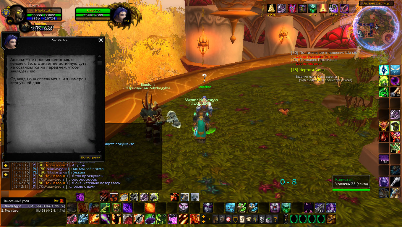 Жмём правой кнопкой мыши, наслаждаемся роликом. В ролике мимолётом показывается М'уру, основное внимание обращено на сам Солнечный Колодец. Мы видим, что несколько эредарских колдунов держат с помощью магии некую девушку, парящую над Солнечным Колодцем. На сей радосной ноте ролик заканчивается, а к нам подлетает Калегос. Сдаём Калегосу квест
