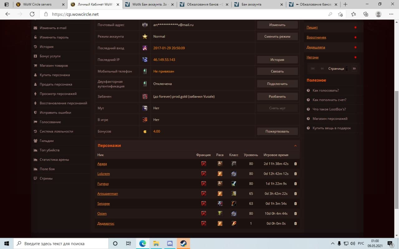 Здраствуйте, долгое время не заходил на аккаунт и появилась проблема в виде бана за продажу голды((до forever) prod.gold (забанил Vusale)) ,хотя продажа никогда не осуществлялась. На серверах Circle играю с давних времен, играл на х15 photo_2021-05-09_01-01-11.jpg. Аккаунт fl1zak ,на данном аккаунте находятся основные персонажи Osten - рыцарь смерти,орк ; Funguy - Воин,таурен ; Agaga - Друид, Таурен ,ники побочных персов - Lolzrem,Artsuperman,Setogee,Дядяартос . Прошу помочь с решением данной проблемы.