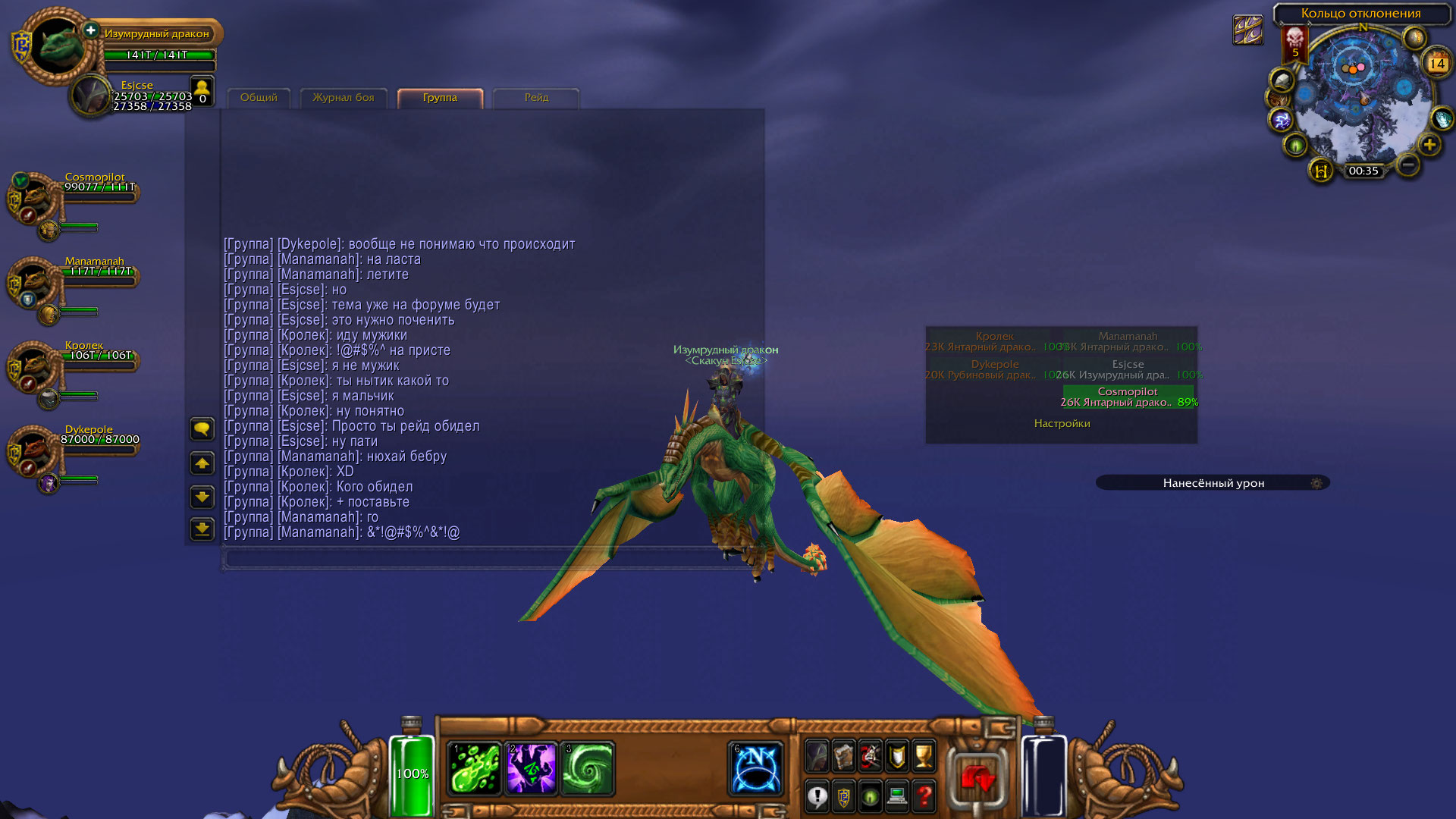 Все было хорошо, пошли ми в ргер Окулус когда убили второго Босса на драках нужно было убивать треш и мага, но один говорит не убивайте треш летите сразу там где будет третий босс, я думаю ладно может быть нашел какой то баг щас увижу потом сообщу Администрации что бы его поченили, но все было бы хорошо но на пати был бой и мне говорят выходи глазом, а виж знаите я люблю виходить из Ргер верным путем тоисть через двери, но к сажелинию я говорю это багоюз, мне говорят там маты уже но мне пришлось прям релогаться что бы бой спал и я неуспел зделать скрин не важно, но в конце зделал скрин.WoWScrnShot_121322_233546.jpgWoWScrnShot_121322_233935.jpgWoWScrnShot_121322_233949.jpgWoWScrnShot_121322_233959.jpg