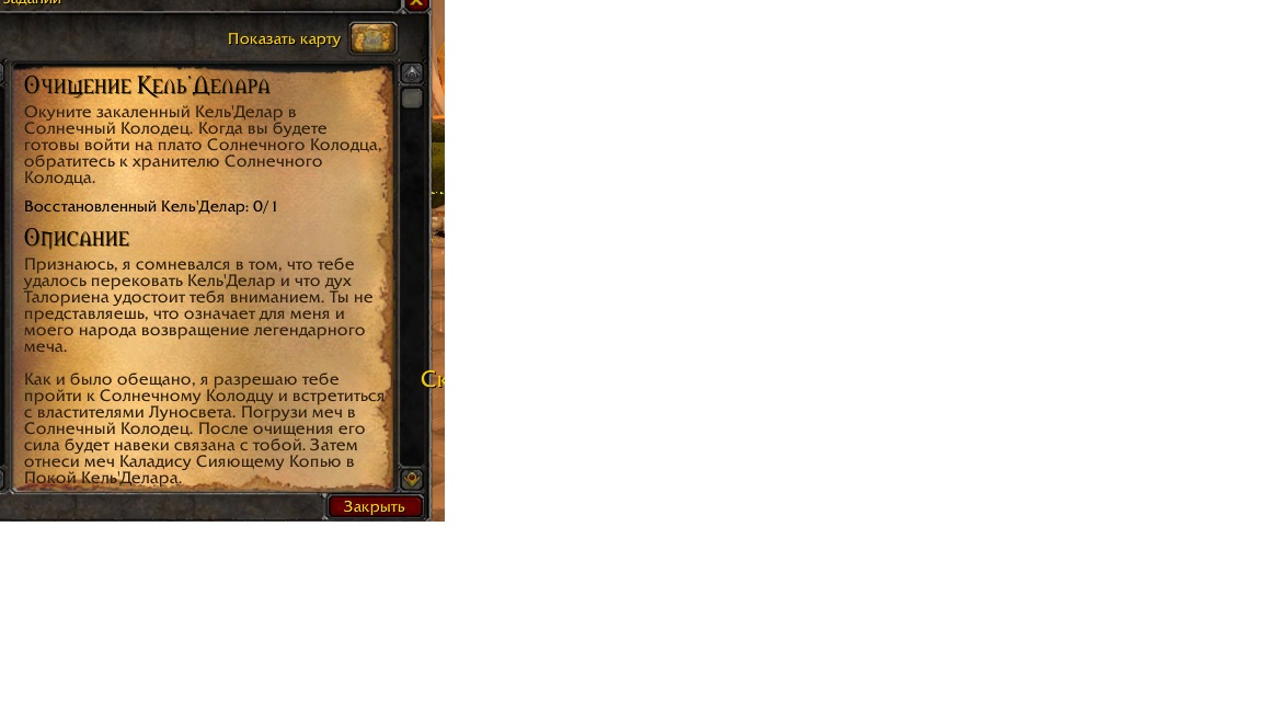 Очищение Кель*Делара , после того как положил мечь в солнечный колодец , взять его от туда нет возможности , он просто не активный , портал в даларан есть , а вот мечь достать из колодца не получается , прошу помощь