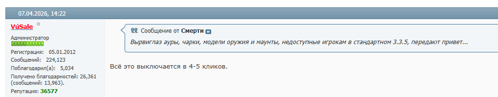Если хотите задать вопрос лично мне, то создайте тему в приватном разделе https://forum.wowcircle.com/forumdisplay.php?f=1739, это не раздел технической поддержки.