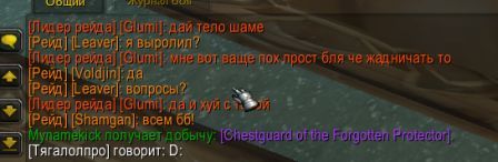Выролил шмотку (первую в инсте) а рейд лидер её анрольнул шаману. Но ладно бы просто шмотку застилил, он с другом начали меня оскорблять и издеваться. Я прошу забанить это быдло.