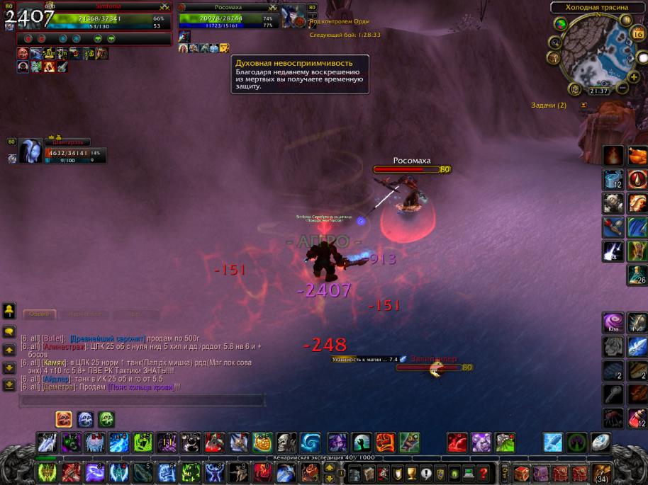 Хитрый хант нападал на ничего не подозревающих граждан. Но после нескольких ударов по шапке бежал к кладбищу, где получал эффект неуязвимости. Запинав свою жертву, он отъедался и вновь выходил на охоту. Скриншоты в реальном времени. Моя смерть от рук супостата, смерть вара заснять не удалось.WoWScrnShot_051613_220050.jpg Сидит, караулит до сих пор.