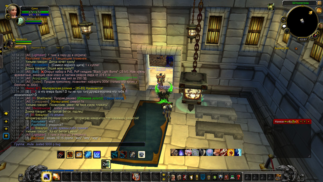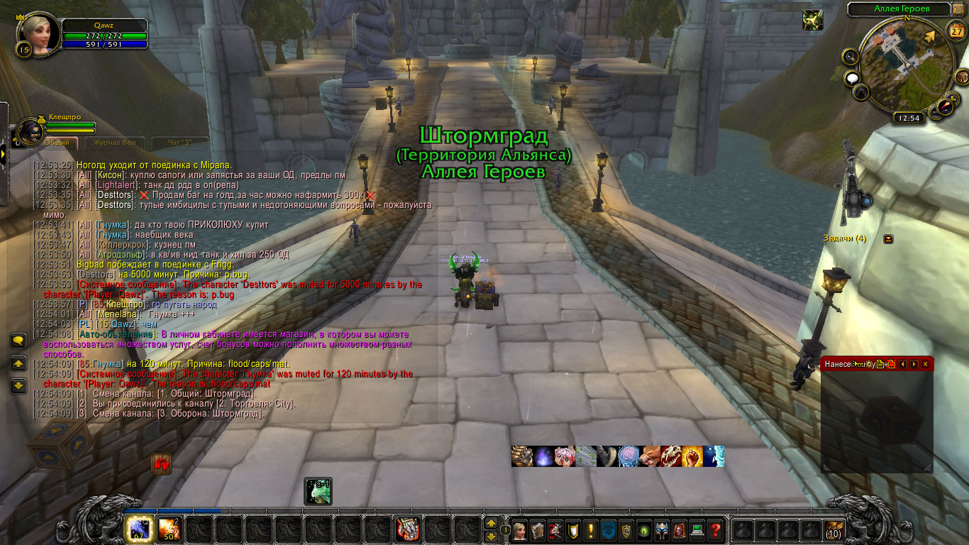 Попал на бг (око бури). Через 3 минуты счёт очков был около 600 / 150, я написал в чат "поле боя" "стадо тупых баранов", потому что весь Альянс бегал 1 кучей, в то время как Орда плотно села на 3 точки и таскала флаг. Получил мут на 4 дня.