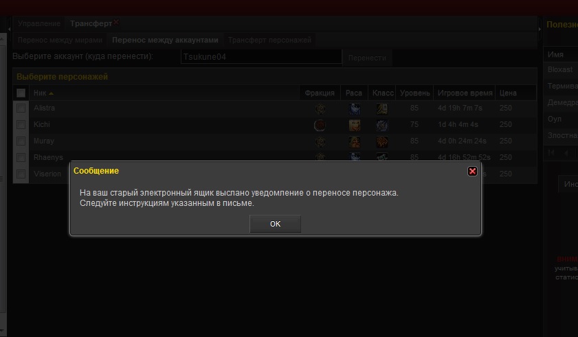 Здравствуйте. Такая беда . Я не могу перенести чара с аккаунта на аккаунт. Просто не приходит емайл с потверждением. в Спаме почты этой тоже нету. Пытался сменить емайл , приходит почта но пишет Operation rejekt ( возможно как-то не так написал , сообщение быстро пропало) . Уже устал писать Гмам и модераторам , может кто подскажет в чем проблема.
