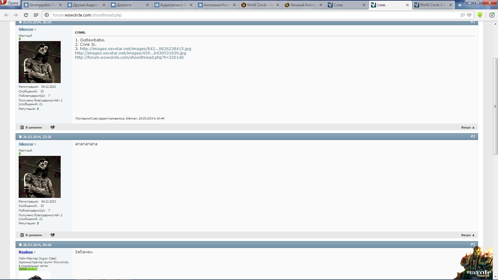 1. повторная подача http://forum.wowcircle.com/showthread.php?t=322763 , вот ты уже банил http://forum.wowcircle.com/showthread.php?t=320437