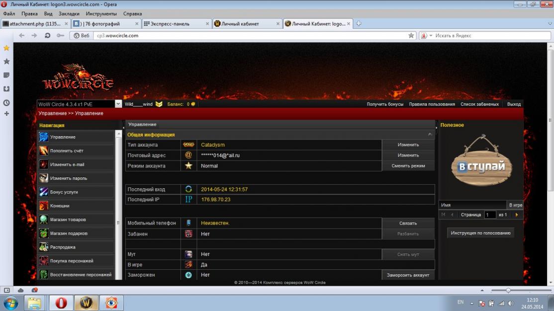 Добрый день уважаемая администрация . Сегодня в 10 утра еще мог зайти в игру а сейчас не могу . Аккаунт norin666 . Имейл был сиркловский . Номера телефона привязано не было . Сегодня при входе в Лк пишет что указан неверный пароль . Есть скрины со вчерашнего вечера Личного кабинета , скрины двух 80 персонажей . Ачив на одном из них и инвентаря . Также есть скрины прокачки .x_5fa7836a.jpgWoWScrnShot_051714_105754.jpgWoWScrnShot_051714_105749.jpgWoWScrnShot_052314_164526.jpgWoWScrnShot_052314_164626.jpgWoWScrnShot_052314_164814.jpg