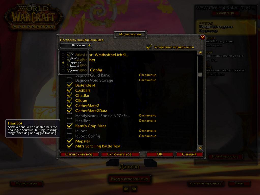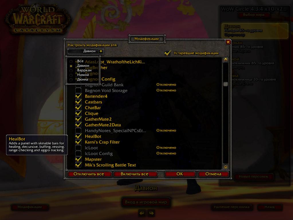 В модификациях можно настроить включение аддонов только для определенных персонажей, там же и отключается.подскажите как отключить хил бот для других персов?