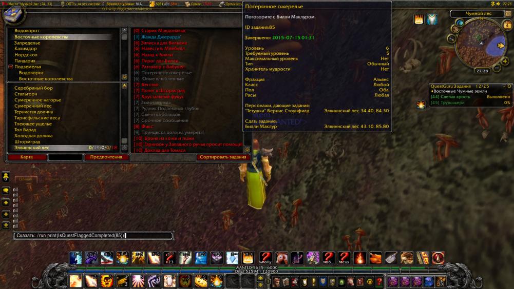 Использую аддон Quest Completist v1.0.0 ссылка http://wow.*****forge.com/addons/que...pletist-v1-00/ так вот думал это баг аддона, но проблема в системе сервера наверное, суть в чем, аддон делает запрос квестов с помощью GetQuestsCompleted(qcCompletedTable) и потом разбирает какие из списка выполненные, но он получает от сервера лиш список выполненных квестов (31308,31309,31548,31549,31550,31551,31571,31572,3 1582,31583,31584,31585,31586,31587,31588,31589,315 90,31591,31592,31593,31785,31812,31813,31814,31815 ,31817,31821,31822,31827,31828,31830,31832,31870,3 1891,31897,31903,31915,31918,31920,31921,31928,319 29,31977,31982,32009) на остальных отвечает как nil тоесть невыполненные, это можно проверить с помощью "/run print(IsQuestFlaggedCompleted(QUEST-ID))" ввести это в чате заменить "QUEST-ID" на номер квеста из базы http://ru.wowhead.com/, пробовал на стандартных квестах в Элвенском Лесу http://ru.wowhead.com/quest=107 , http://ru.wowhead.com/quest=84 , http://ru.wowhead.com/quest=85 которые у меня выполненные, но ответ от сервера nil, тоесть невыполненные.. если я все правильно понимаю то это проблема сервера, или может я где-то ошибся?? Если я все правильно понял, то любой квестовый аддон не может получить правильный ответ от сервера на запрос по поводу квестов..