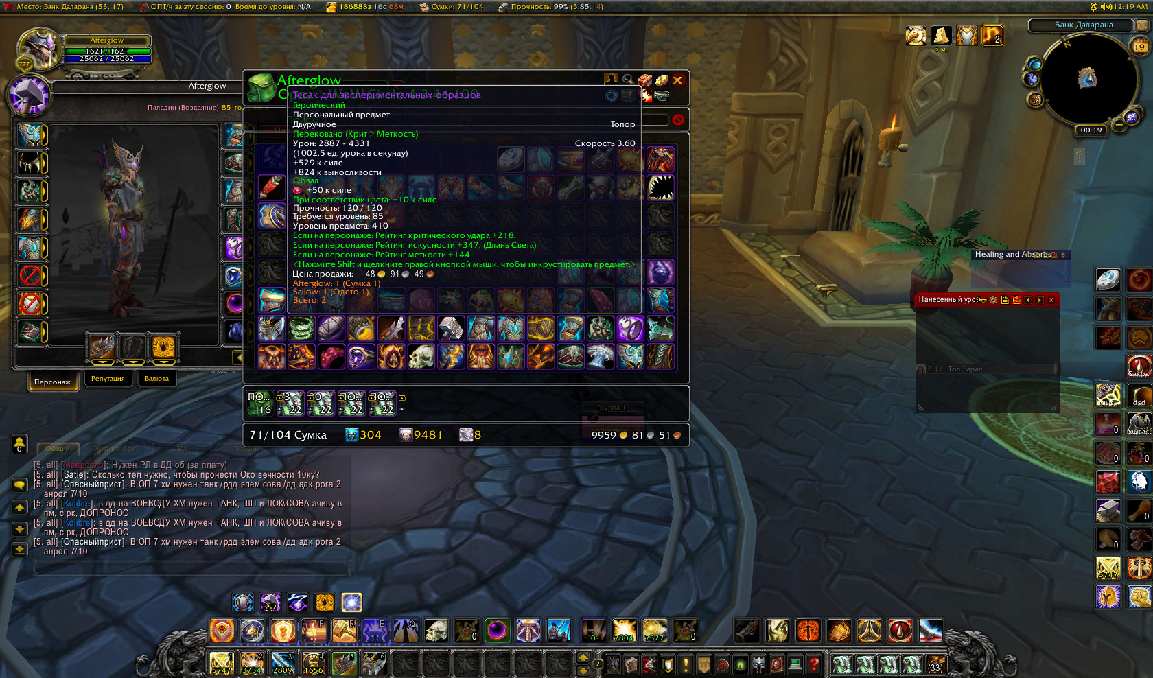 Паладин, Орда, Эльф Крови, ник- Afterglow причина продажи: Ушел на лич x100. Бис ретрик, бис протопал, предбис хпал(не хватает кольца). Есть пвп на холика, также Од и Оз (видно на скринах), Перса могу показать и скинуть необходимые скрины! Цена 1100+% Торгуемся)