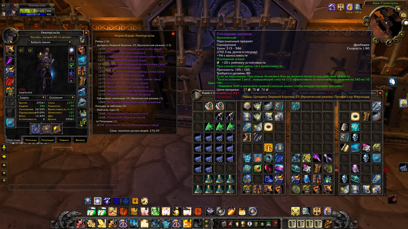 Оригинал сообщения:Немного о чаре. Паладин почти биc во всех спеках. Рпал предбис. По поводу ачив, нечего не могу сказать, там все печально). В общем то сразу к делу, все будет видно на скринах, по надобности покажу в игре. ПЕРСОНАЖ НА ПОЛОВИНУ ЗАДОНЕН.