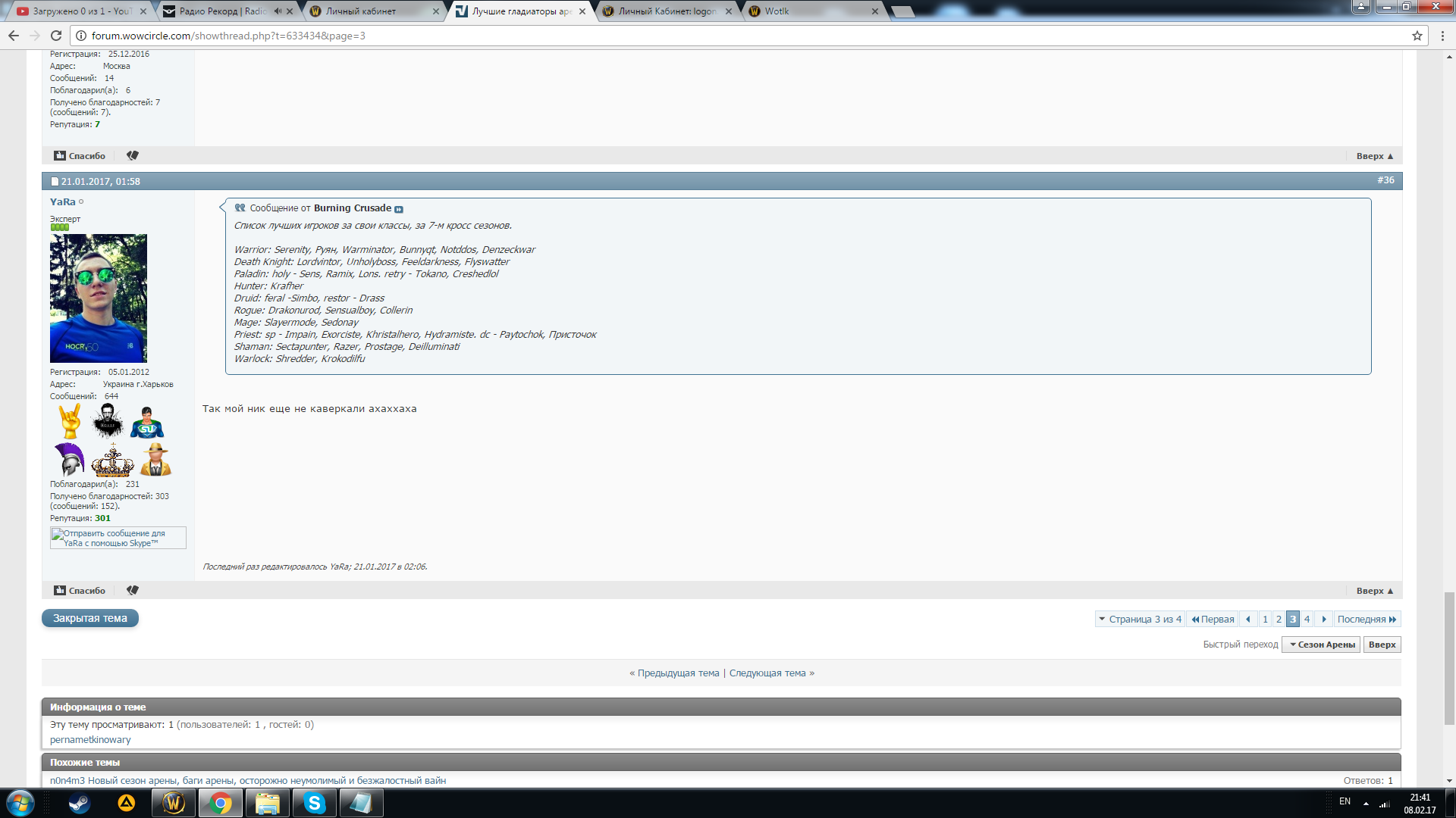 Yara, Модератор чата 3.3.5а Fun. Расскажу про его. Во время осеннего сезона якобы он регал за мага в шатере с х10(позже оказалось, что на маге играл слаер), понты кидал, я еле-еле тогда в скайпе сдержался, чтобы не поставить на место 2к парнишку, который нас бы зафармил(убили 2 раза из-за моего дискона). Вот парочка скринов, как знал, что пригодятся