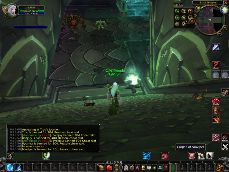 demo Забанен: до 2012-06-19 19:11:18 на 30 дней Result ) дело в том что мы были ги рейдом в Бт шли через треш дошли до орка и вайпнули я сразу же офф начал заходить через часа полтара и уже был бан я даже не знаю причину бана тоесть я посмотрел в бан листе что причина чит рейд и сразу же обратился к гм мастеру и он посоветовал отписатся на форуме прошу разбанить мой акаунт так как бан был получен не за что!!! извените но докозательст у меня нет !((( прошу хотяб снять бан с акаунта и заблокировать чат !! надеюсь на понемание ситуации!!!!! set realmlist ******.wowcircle.com И ПРИМИТЕ В СВЕДЕНЯЕ ЧТО В БТ ТРЕШ РЕСАЕТСЯ !!!!!!