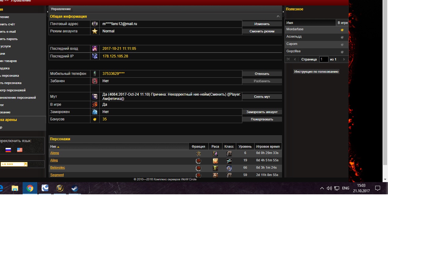 Ув. Администрация прошу обжаловать мой мут короый был наложен в связи с некоректным ником , я не пойму что в моём нике не так ? (скрин мута и ников на акке , ток сотри на скрине почту ) http://images.vfl.ru/ii/1508588610/3...d/19084292.jpg http://images.vfl.ru/ii/1508588893/a...0/19084365.jpg