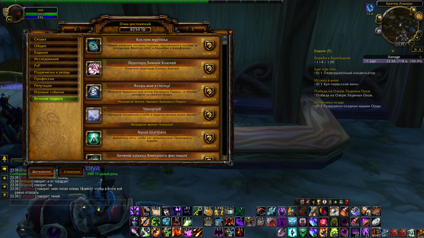 8200+ ачив,много званий(Чокнутый,Морской дьявол,шеф-повар,Неумирающий,Бессмерт ный,Звездный странник,Говорящий со звездами и т.д.),10 страниц маунтов,6 петов. В банке много трансмута как сетов,так и пушек и прочего.