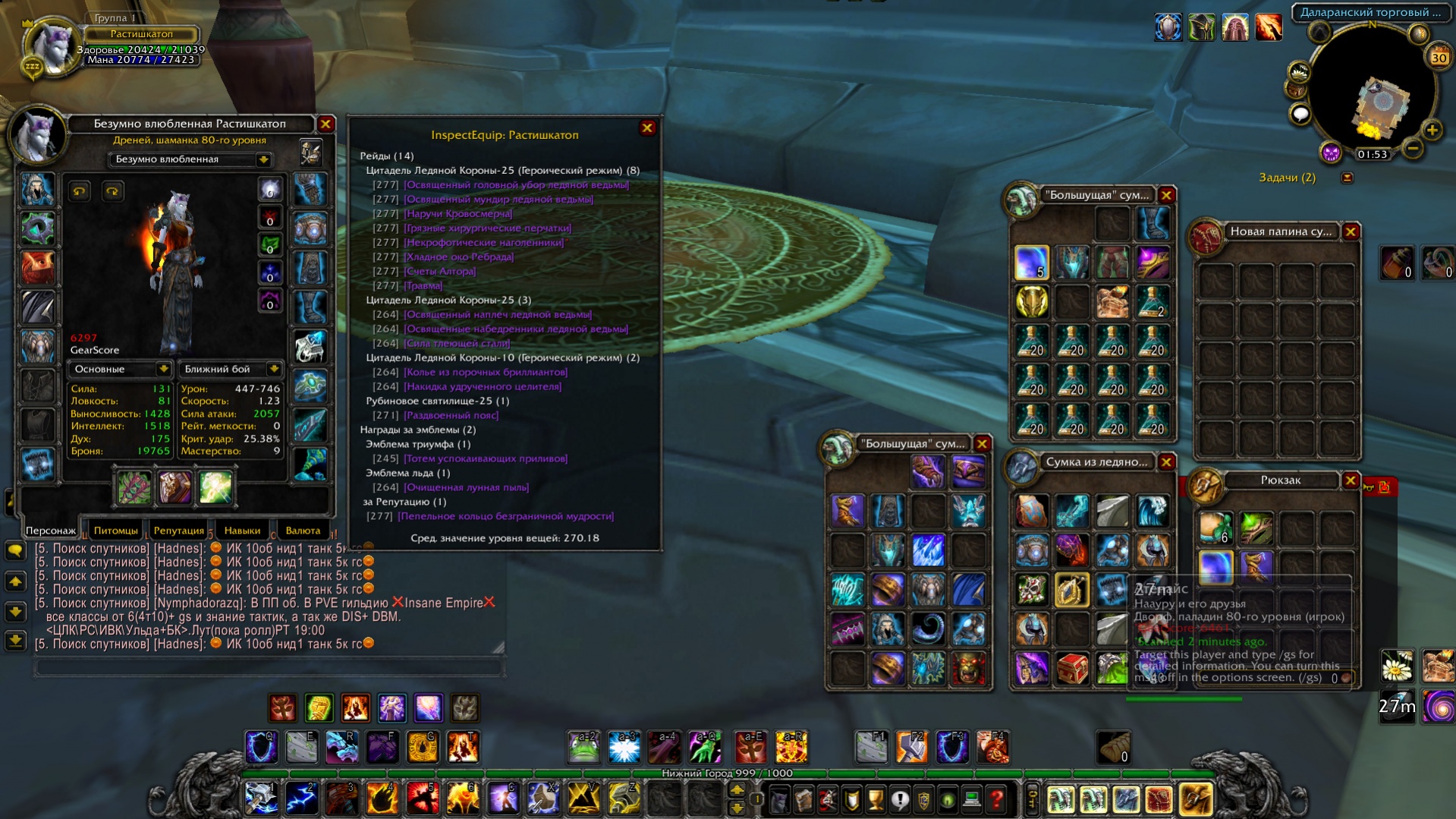 Энх и хил шаман. Отлично себя показывает в любых инстах всех уровней сложности. Колличество ачив 2855. Из маунтов в наличии синий протодракон и ракета любви. Хонор убийств 6808. Профы юва и травник по 450.