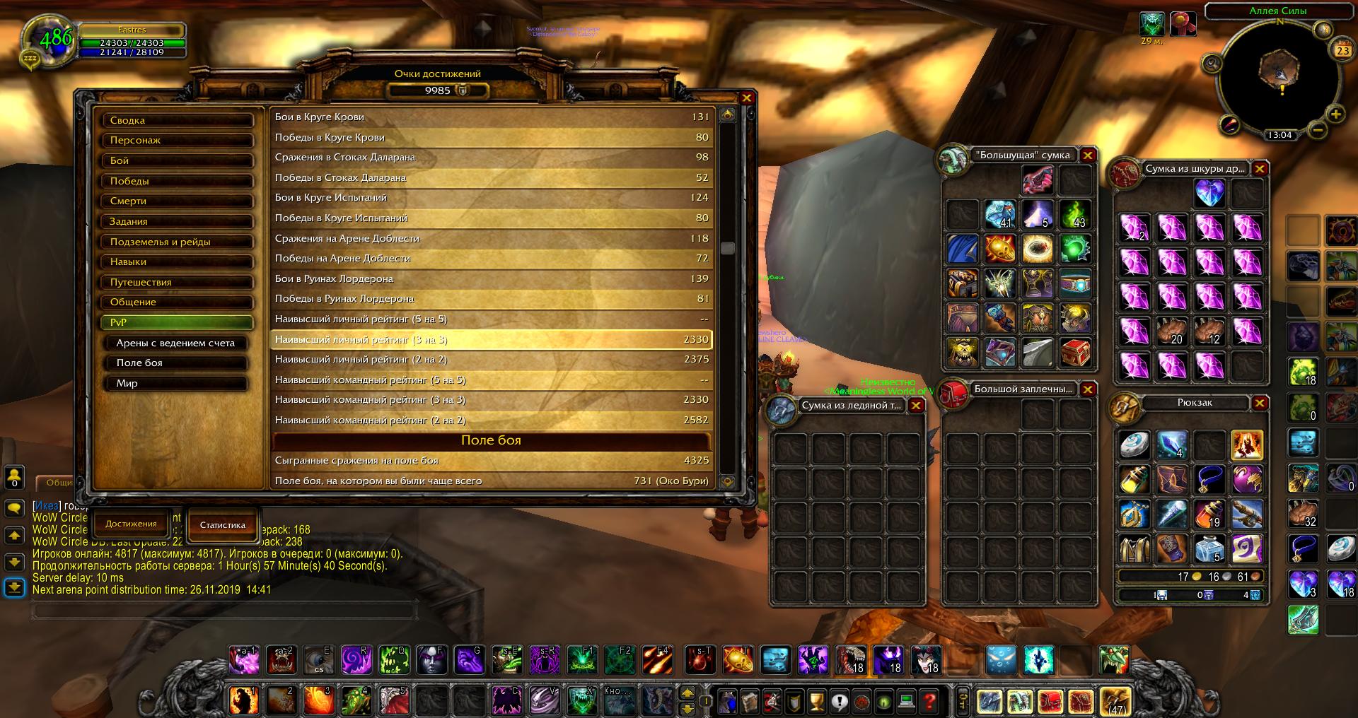 3. 6481 гс пве + 5/5 а8 пвп с т2 кинжал и посох, а8 и т2 апнуты(эксп 3х3 2300+ 2х2 2300), 9985 ачив! 29к киллов, много званий и маунтов!